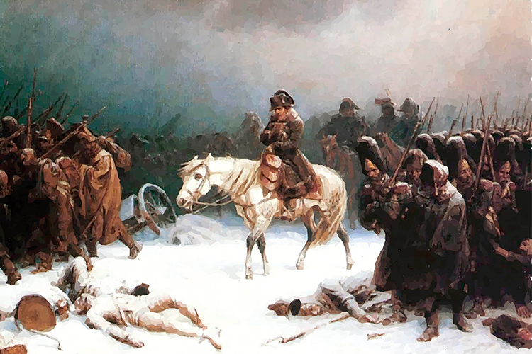 La imagen que nos muestra la retirada del ejército de Napoleón en Moscú, vencido por las gélidas temperaturas del invierno de 1812, derrotado por el «General Invierno», aliado de Rusia contra sus invasores. Científicos suizos han realizado un estudio sobre los distintos ejércitos que han intentado invadir Rusia, y sus fracasos ante la llegada del invierno. Les han sido de gran ayuda 545 muestras de árboles de las montañas eslovacas del Tatra: observando los anillos correspondientes a su crecimiento durante los últimos quinientos años, comprobaron que, entre 1808 y 1837, los inviernos fueron especialmente crudos y largos. De hecho, han asegurado que incluso las primaveras de aquellos años se encuentran entre las más frías de los últimos cinco siglos. La Grande Armée no soportó las temperaturas de incluso –50 °C, y la derrota fue estrepitosa.