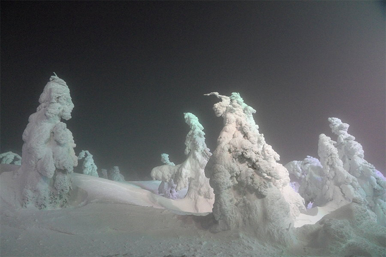 En las montañas del extremo norte de Japón, cada invierno se produce un fenómeno muy curioso y de una belleza increíble: la niebla engelante cubre los árboles aislados con escarcha y, a continuación, descargan intensas nevadas; entonces se vuelve a formar niebla y vuelve a nevar… Y así sucesivamente hasta que los árboles se transforman en juhyou o árboles escarchados, aunque popularmente se conocen como «monstruos de nieve» por las formas que adoptan. Miles de personas se dirigen a estas montañas para admirar el fenómeno. Cuando el sol está a punto de ocultarse, los «monstruos» se tiñen de colores fantasmagóricos. El espectáculo está garantizado, aunque que últimamente, con tanta nieve, hay muchas dificultades para llegar hasta ahí.